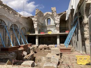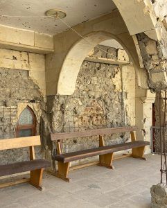 Paseando entre las ruinas de esta parte de la ciudad llegamos a la plaza de las cinco iglesias. Allí entre sus ruinas al lado de la Iglesia de Al Tahira el Papa ofició la misa en su paso por Mosul en el 2021. Pudo ver el precio que ha pagado Mosul a causa del Estado Islámico.