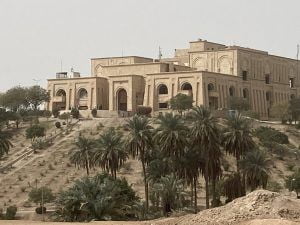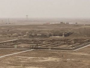 En lo alto de la colina que está a un lado de la ciudad Saddam Hussein mando construir uno de sus múltiples palacios. En realidad nunca lo vio acabado , pero desde allí tenía unas vistas privilegiadas a Babilonia. Solamente visitó una vez el lugar, cuando eligió el emplazamiento.