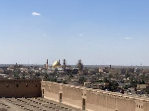 Karbala ; Tras Babilonia , nos dirigimos a la ciudad Santa para los musulmanes chiitas de Kerbala. Es la localidad más conservadora de Irak , junto con Nayaf, y aquí está enterrado Hussein el nieto de Mahoma hijo de Fatima. De hecho ya en el bus las mujeres nos tenemos que cubrir completamente para ir hasta el hotel y más tarde a la mezquita