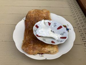 Se trata de un especie de milhojas bañado en miel con un queso fresco de búfala y un té. Absolutamente exquisito.