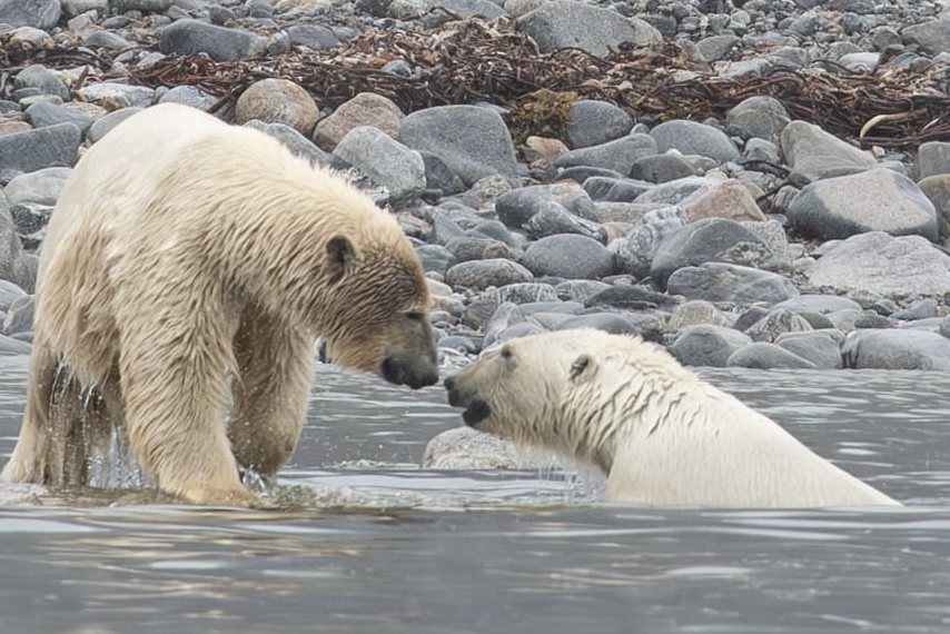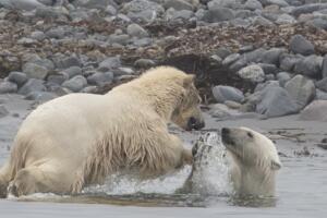 Los machos suelen matar a las crías para poder aparearse con la madre. La osa y su cría pequeña dan media vuelta y se alejan. Con lo que el macho vuelve a la playa en busca de comida que al final encuentra en el cadaver de una foca  .