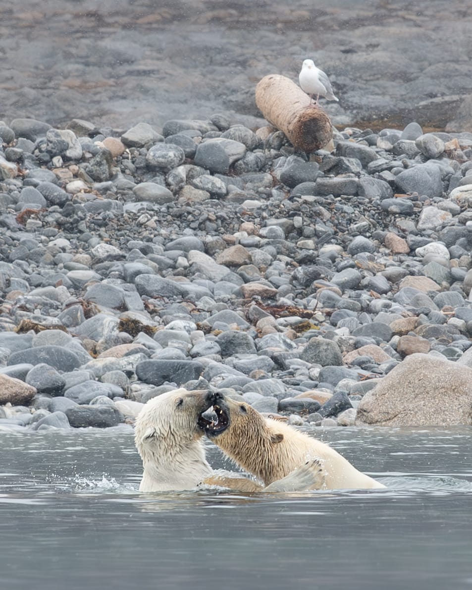 Tras el desayuno hay un cambio de planes. En vez de desembarcar donde teníamos previsto con el plan A , pasamos al pan B. La razón es que en la zona de Amsterdamøya han sido avistados dos osos polares jugando en el agua. Con lo que el plan ahora es ir en las zodiacs lo más cerca que se permite ver a estos dos osos.