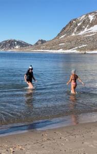 El landing de por la tarde se hace en una preciosa playa con un tiempazo espectacular en  Sjuøyane y tras el trekking de rigor viene la sorpresa. El que quiera puede darse un chapuzón en las frías aguas del Ártico.