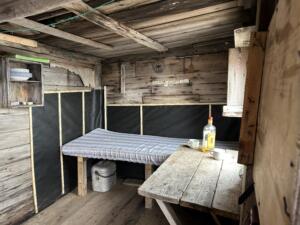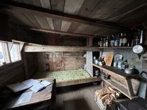 Por la tarde desembarcamos en Alicehamma . Allí se encuentra la cabaña que construyó en 1920 Sven , un sueco que trabajó en una mina de carbón a unos 90 km de Longyearbyen. Tuvo un accidente dentro de la mina se quemó la cara quedando totalmente desfigurado. Por todo ello tras el accidente se retiró aquí y se hizo cazador de osos, zorros y renos. Además de esta cabaña construyó un par de ellas más a unos 100 km de distancia la una de la otra. Tras su muerte esta cabaña cayó en ruina y hace unos 10 años el gobierno noruego la rehabilitó y ahora está equipada con todo lo necesario para servir de refugio si hiciera falta