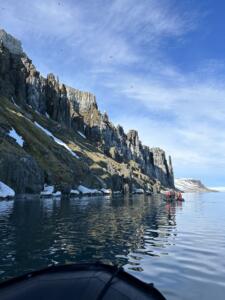 Abandonamos Longyearbyen hacia el norte de la isla de Spitsbergen, a una latitud de 78 15.3 N con una temperatura de 5 grados pero con un viento helador . En cuanto abandonamos el fiordo el barco se mueve bastante, algo que con suerte no me afecta.