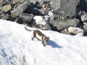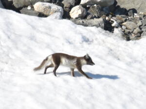 Tenemos la suerte de ver un zorro ártico buscando huevos de Guillemots antes de que se esconda entre las rocas.